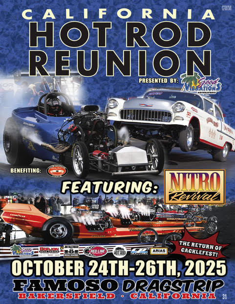 Quarter-Mile Nostalgia Drag Racing, the Famed Cacklefest®, Vintage Race Cars, Hot Rods and Customs, Swap Meet and more at the Famoso Raceway in Bakersfield, California. The California Hot Rod Reunion presented by Good Vibrations Motorsports -- Tickets available at FamosoDragstrip.com/HotRodReunion/
