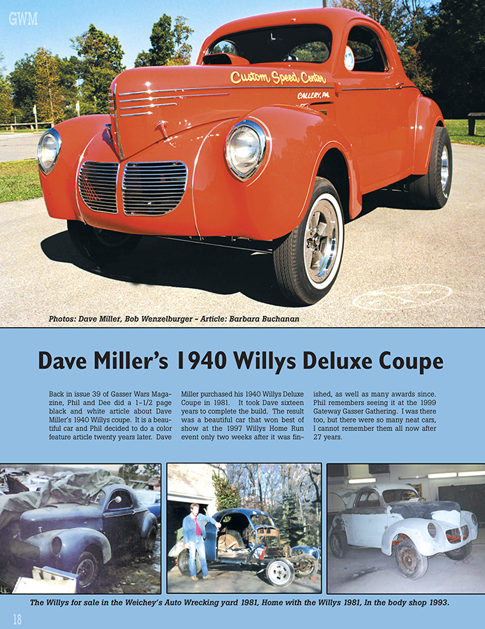 The majority of our magazine is about readers rides. We've had some pretty amazing stories over the years, like the fantastic 8 part series of articles, starting in issue 32, by Gasser Legend Barb Hamilton, the first woman licensed by NHRA to drive a supercharged car. She not only raced and beat the guys, but built her own car and motor. She is absolutely Dee's hero! In issue 55, is Noel Brown shared his radical and beautifully engineered '49 Anglia with us. And how many of you were fans of Bill Drake, with the Ol' Rumble Guts Austin. He sent us a very interesting letter, featured in issue 56, about the end of the track in Utica-Rome, NY in the late 60's. In issue 63, Photographer Dave Davis sent us a story on an incredible Barn Find. Mark Kluge, while gassing up one of his old cars had a woman walk up and tell him her husband had a car like his for sale. Turned out to be a 1940 Willys Deluxe Coupe. Did he buy it?? Then there was the article sent to us by Ron Normann. He has his own "Gasser Wars" going on with his Airoso Brothers '41 Willys Coupe and his Hairy Hauler '41 Willys truck. You can read about Ron's Willys in issue 65. I could go on and on, because these are just a few of the 100's of great stories in the pages of Gasser Wars Magazine.